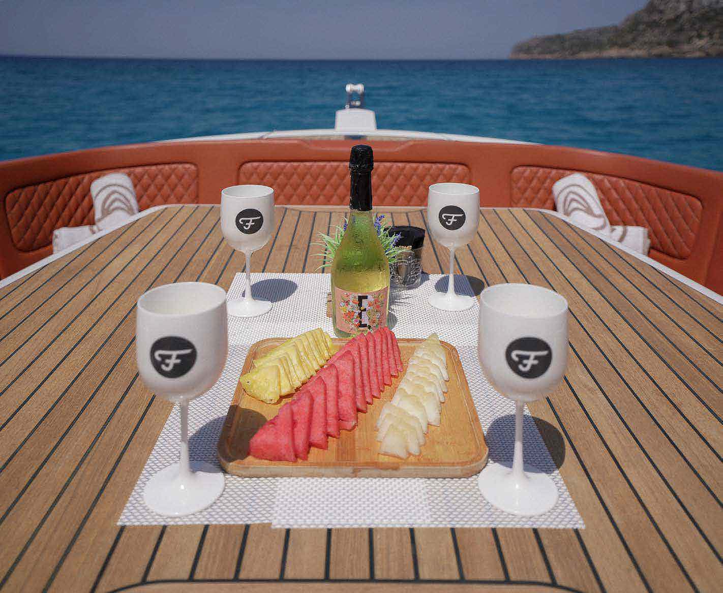 • Included: Captain, insurance, towels, complimentary drinks (water, ice, 18 soft drinks, 14 beers, 1 white wine, 1 rosé, 2 cava), snacks, paddle board, snorkelling equipment